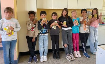 Die Schülerinnen und Schüler ernteten voller Eifer zunächst Äpfel im Schulgarten. Der Schulgarten ist ein wichtiger Bestandteil des Schulalltags und bietet den Kindern die Möglichkeit, etwas über die Natur und Teamarbeit zu lernen. Die Äpfel wurden in die Lehrküche gebracht, gewaschen und sortiert. In der Koch-AG schälten, entkernten und schnitten die Mädchen und Jungen unter Anleitung der pädagogischen Fachkraft Frau Bohn die Äpfel. Anschließend wurden sie mit Zucker und Zimt gekocht, bis ein leckeres Mus entstand. Das fertige Apfelmus wurde in Gläser abgefüllt. Die jungen Köchinnen und Köche der Koch-AG waren stolz auf ihr Werk und freuen sich auf die nächste AG-Stunde, denn die Ernte war so reichlich, das noch weitere Rezepte ausprobiert werden können.