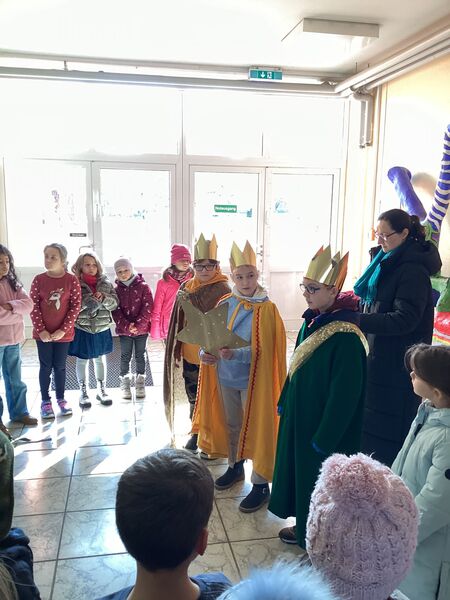 Am ersten Schultag nach den Ferien kamen vier Schülerinnen und Schüler aus den Klassenstufen 3 und 4 als Sternsinger gekleidet in die Schule. Neben den Heiligen Drei Königen war auch eine Sternträgerin dabei. Die Kinder sangen das bekannte Lied "Stern über Bethlehem", das zum Mitsingen einlud, und trugen verschiedene Sprüche vor. Außerdem wurde der Segensspruch "Christus mansionem benedicat" mit der Jahreszahl 2026 als Schild über die Eingangstür der Schule geklebt. Diese schöne Tradition sorgte wieder einmal für einen festlichen Start ins neue Jahr.