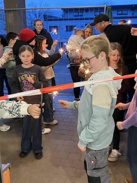 Der Umbau der Marksburgschule ist seit Monaten in vollem Gange und die Schülerinnen und Schüler können mit Spannung verfolgen, wie sich das Schulgebäude Schritt für Schritt verändert. Im Zuge der Bauarbeiten mussten zwei Klassen ihre bisherigen Räume verlassen, um an einem neuen Ort weiterlernen zu können. Während die 2. Klasse vorübergehend im ehemaligen Handarbeitsraum untergebracht ist, durfte sich die Klasse 4b über einen nagelneuen Klassenraum freuen. Unter Federführung von Hausmeister Uwe Hartmann fand bereits vor einer Woche der Umzug statt. Statt einer Weihnachtsfeier hatte sich die Klassengemeinschaft bereits im Vorfeld darauf geeinigt, den neuen Raum feierlich einzuweihen und lud Eltern und Schulleiterin Sarah Thunert zu ihrer „Einweihungsparty“ ein. Und wie es sich gehört, wollten auch die Viertklässler es sich nicht nehmen lassen, ein rotes Band durchzuschneiden. Dieser Wunsch wurde ihnen erfüllt. Die Klassensprecherinnen und Klassensprecher übernahmen den feierlichen Akt, umringt von ihren Mitschülerinnen und Mitschülern, die mit Wunderkerzen und einer selbstgebastelten Konfettipistole für eine stimmungsvolle Atmosphäre sorgten. Im Anschluss wurde bei Gesprächen, Spielen, Malen sowie gemeinsamen Essen gefeiert. Am nächsten Tag wurde als letzter Feinschliff noch die Deckenbeleuchtung fertiggestellt. Das Arbeiten im neuen Klassenraum macht allen große Freude. Nun kann man sich schon vorstellen, wie schön die Marksburgschule nach Beendigung der Baumaßnahme sein wird.