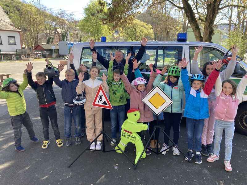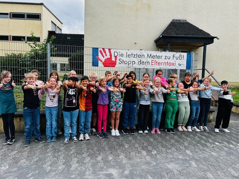 Dazu passend wurde das Transparent „Die letzten Meter zu Fuß – Stopp dem Elterntaxi“ aufgehängt. Dieses gehört zu einer Initiative des Forums Verkehrssicherheit Rheinland-Pfalz. Die Kinder hatten viele Vorschläge, wie sie ohne Auto in die Schule kommen könnten und bei denen, die aus Gründen gefahren werden, kam die Idee auf, dass sie eben die letzten Meter zu Fuß gehen könnten. Zum Beispiel ab Ende Charlottenstraße oder ab einem Supermarkt. Übrigens ginge das auch im Winter oder bei Regen, merkten einige Schülerinnen und Schüler an.