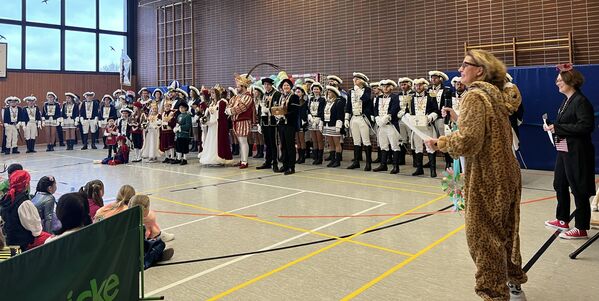 Nach der Begrüßung durch die Kita-Leitung Esther Verhoeven sorgten die närrischen Regenten für gute Stimmung in der bunt geschmückten Narhalla. Sie freuten sich sehr über die von den Kita-Kindern liebevoll gestalteten Orden und Geschenke. Ehe die Prinzenpaare selbst das Wort ergriffen, wurden sie von Schulleiterin Sarah Thunert vorgestellt.