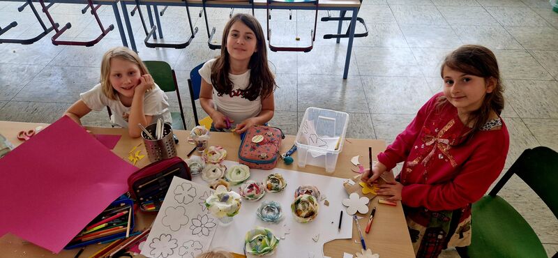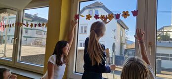 Nach dem großen Erfolg der Karnevalsgirlanden haben die Kinder nun bereits die nächste Dekoration hergestellt: bunte Blumen-Girlanden für das Frühjahr. Diese sollen nicht nur die Schülerinnen und Schüler im Schulgebäude, sondern auch die Fußgängerinnen und Fußgänger in der Stiftstraße erfreuen. Die ersten Blumen-Girlanden können bereits bewundert werden.